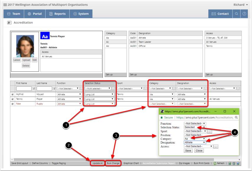 Bulk update allows you to change a lot of information at one time within the Accreditation Module. For example, if you have added your long list of team members without a category or designation, you can use bulk update to change them OR change their Selection status from Long List to ‘Selected’ (once they have been confirmed as part of your delegation).