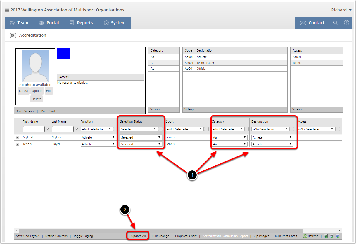 You can also manage an individual team member settings, simply by double clicking on a name or by dragging the persons name into the top half of the screen (into the Accreditation Card).