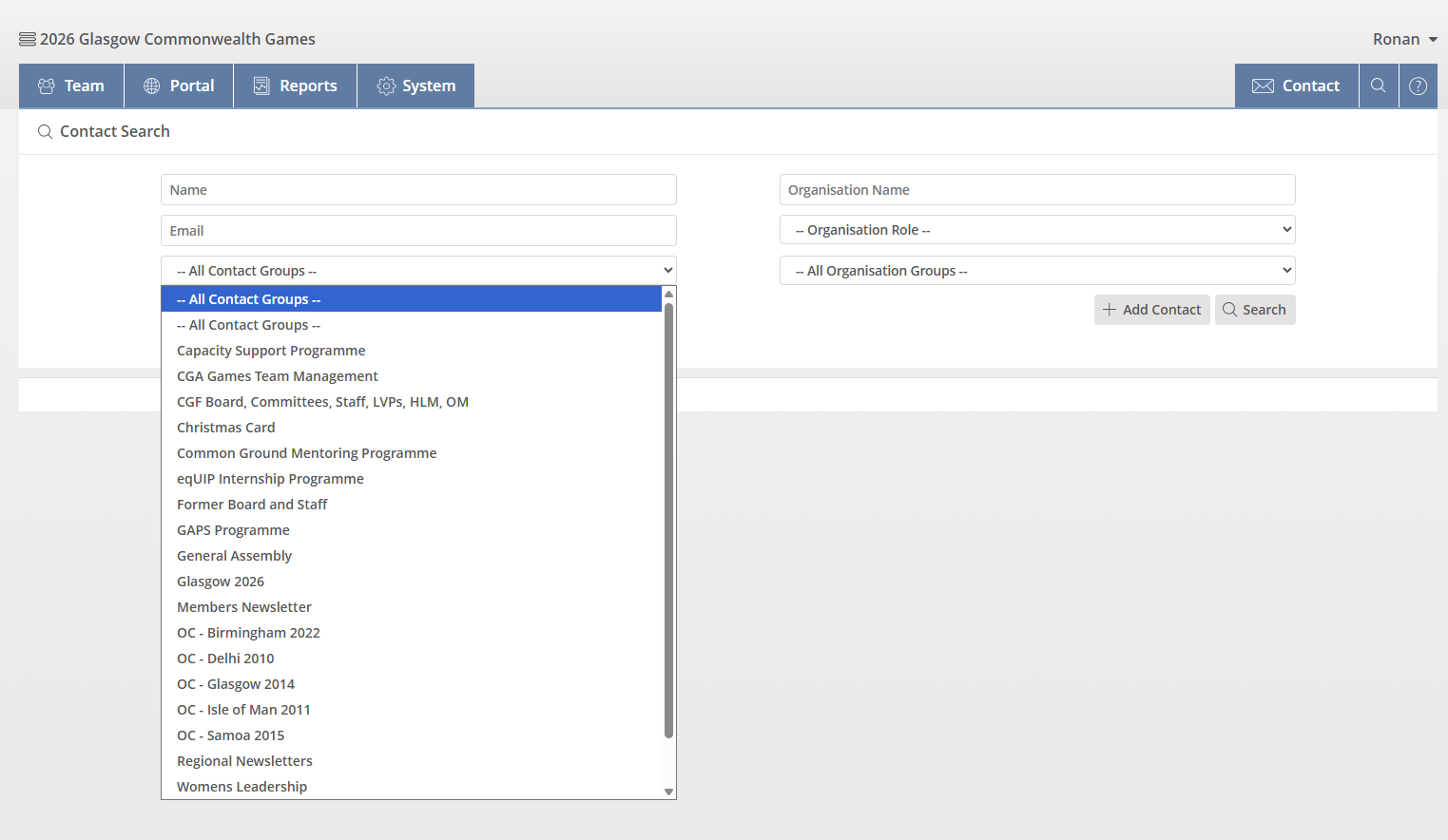 Contacts can be grouped to facilitate email and information distribution related to regular NOC/CGA/NPC activities e.g. Board Members, Sponsors, VIP, etc.