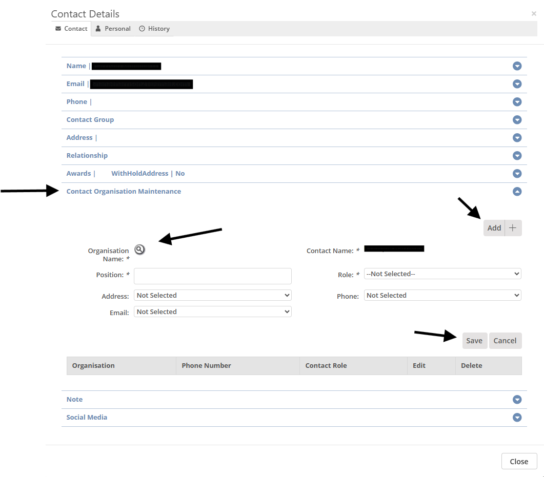 - Click on ‘Contact Organisation Maintenenace’ accordion. All organisational associations for the contact can be seen here.
