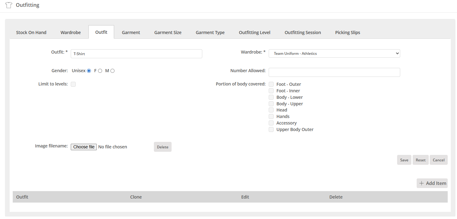 NOTE: ‘Limit to Levels’ should only be ticked if only specific individuals in your team will receive all garments in this outfit. For example – if you were doing clothing for your Executive Board that was completely different than your standard clothing items or an item for your Sport Managers only as an example.