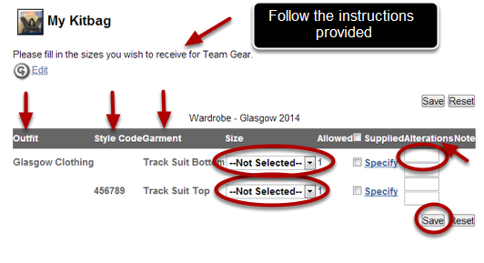 The team member can fill out the sizes for the Kitbag on their own, OR the team manager/official can also input the data.