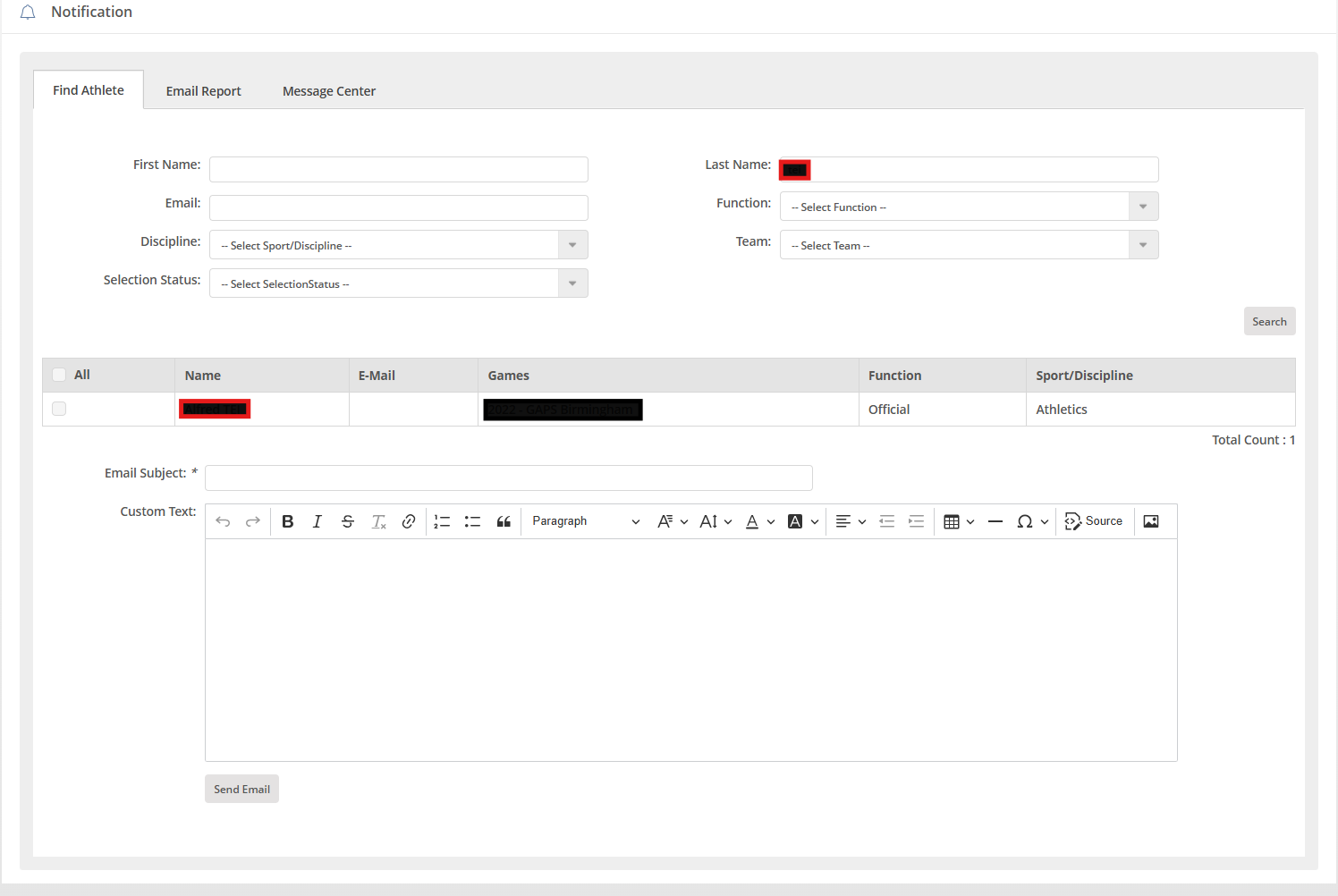 - Next to the Find Athlete tab is the Email Report which gives you valuable data about the email you just sent giving access to the Portal.