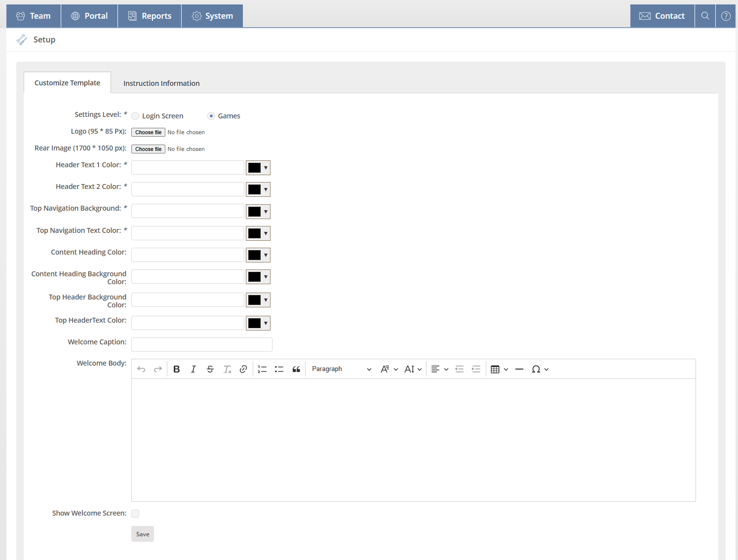 - The ‘Welcome Page’ is administered through the ‘Customize Template’ tab. If you want to customize the text that team members first see when they log in you can create a welcome page.